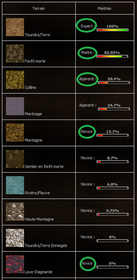 Chaque fois que vous vous déplacez, vous augmentez de 1% (par mouvement) votre compréhension du terrain sur lequel vous vous trouviez avant de bouger (et non le terrain de la case ciblée).